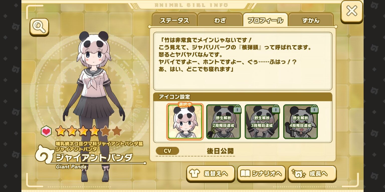 Annictでジャイアントパンダ (けものフレンズシリーズ)をチェック! Annict (アニクト)は、見たアニメを記録したり、見た感想を友達にシェアすることができるWebサービスです。「今どの作品を何話まで見ているんだっけ?」を解消します。 体力測定交換所 ジャイアントパンダ編 期間限定ミッション 期間限定しょうたい ※前回との変更点:エクストラクエストが各難易度バトル1のみになりました 「隊長さんセレクト」のフレンズは前半・後半でそれぞれ自由に1キャラ指定することができ 『けものフレンズ2』とのコラボイベント第二弾にて登場。 期間限定のコラボしょうかんより入手できる。 イベントストーリーではジャイアントパンダと一緒にいる所をアルマーとセンちゃんに出会う。 ジャイアントパンダは笹を食べているのにセンちゃんは早とちりからジャパリまんを